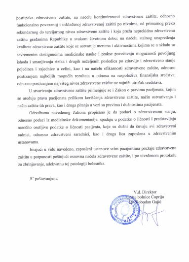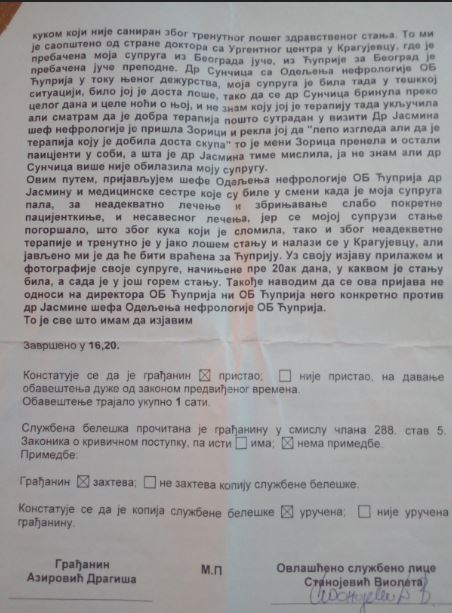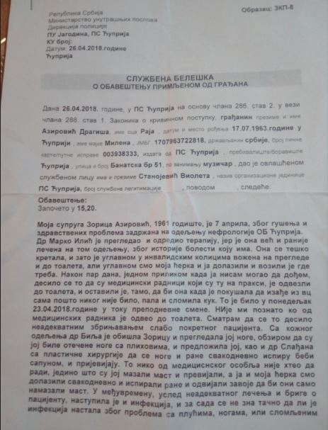 On je Policiji prijavio šefa odeljenja nefrologije OB Ćuprija i medicinske sestre koje su bile u smeni kada je njegova supruga pala, za neadekvatno lečenje i zbrinjavanje slabo pokretne pacijentkinje i nesavesnog lečenja.