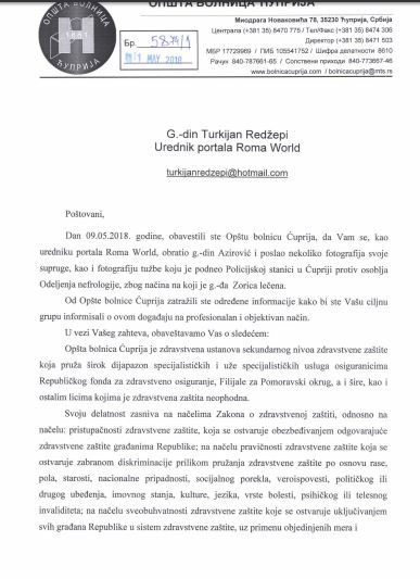 Kao što sam Vam i rekao u našem telefonskom razgovoru, našem mediju „Roma World“, obratio se g. Azirović, i poslao nekoliko fotografija svoje supruge kao i fotografiju tužbe koja je podneta 26.04.2018.g. u PS Ćuprija protiv dr Jasmine šefa Odeljenja nefrologije OB Ćuprija zbog načina na koji je gospođa Zorica lečena.Ovu informaciju želimo da plasiramo na profesionalan i objektivan način kako bi naša ciljna grupa imala tačne informacije o ovom događaju.Ono što naš medij interesuje je sledeće:Da li je 23.04.2018.g., u prepodnevnim satima zbog nemara radnika gospođa Zorica polomila kuk?Da li su ispiranje rana vršili medicinske sestre ili članovi porodicetokom njenog boravka u bolnici ?Da li je bilo diskriminacije tokom lečenja Zorice Azirović u OB Ćuprija na odeljenju nefrologije?Srdačan pozdrav,Turkijan Redžepiurednik portala Roma Worldkont.tel.0615822530