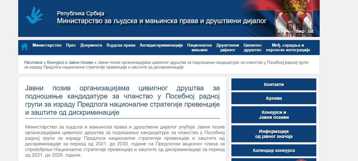 Ministarstvo za ljudska i manjinska prava i društveni dijalog upućuje Javni poziv organizacijama civilnog društva za podnošenje kandidature za članstvo u Posebnoj radnoj grupi za izradu Predloga nacionalne strategije prevencije i zaštite od diskriminacije za period od 2021. do 2030. godine sa Predlogom akcionog plana za sprovođenje Nacionalne strategije prevencije i zaštite od diskriminacije za period od 2021. do 2025. godine.