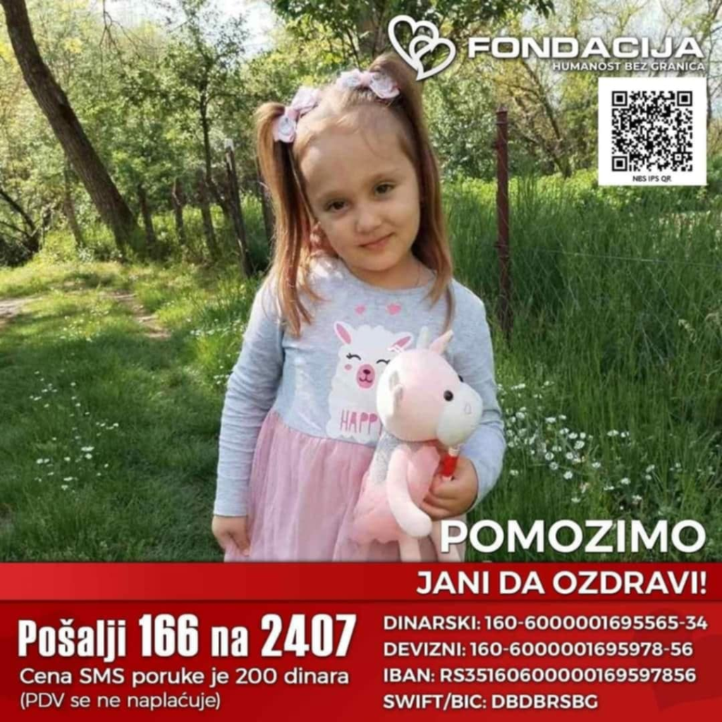 11-godišnja Jana Marković boluje od veoma teške bolesti. U avgustu ove godine trebalo bi da se podvrgne radioterapijskom tretmanu u Turskoj radi uništavanja ćejile raka. Ovaj tretman je skup, tako da svaka naša pomoć je dobrodošla.