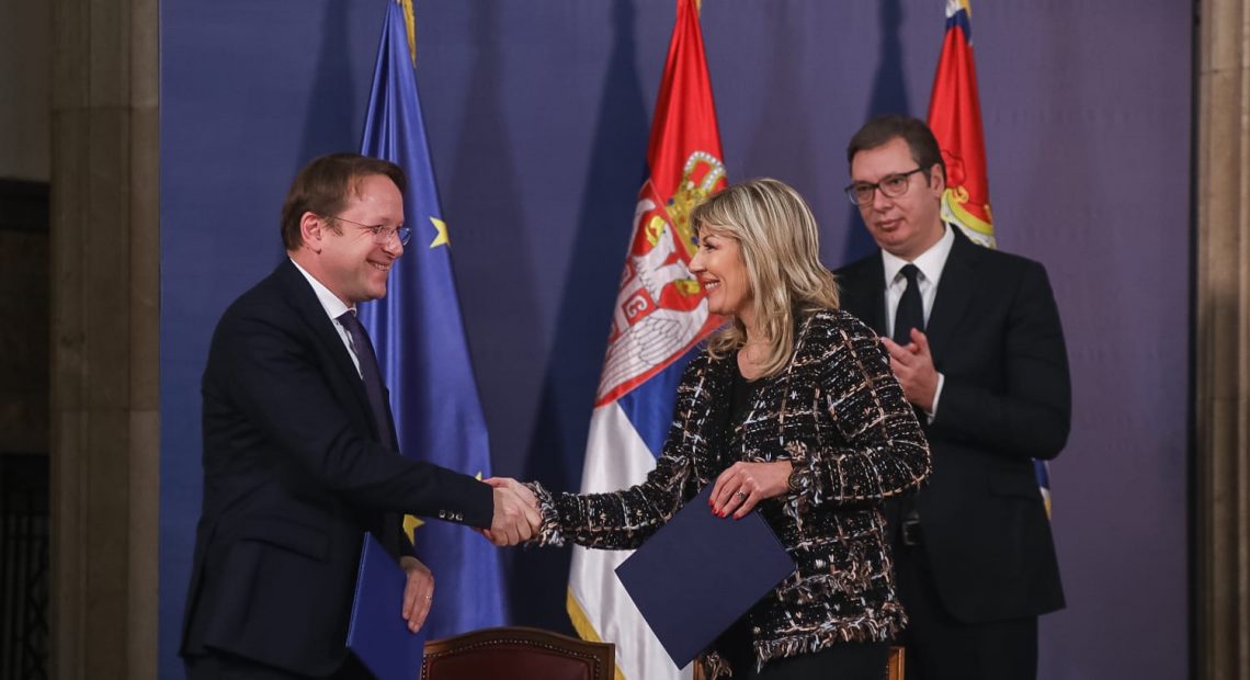 Najnoviji sporazum su danas potpisali ministarka za evropske integracije Jadranka Joksimović i evropski komesar za susedstvo i pregovore o proširenju, Oliver Verhaji u prisustvu predsednika Aleksandra Vučića i šefa Delegacije EU u Srbiji, ambasadora Sema Fabricija.